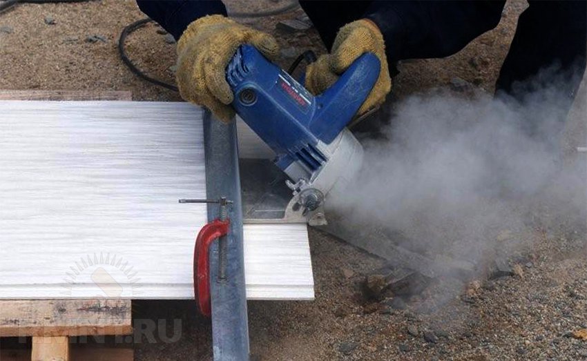 Это не самая легкая часть работы, даже не смотря на то, что толщина одной панели всего 1 см. Фиброцементный сайдинг можно резать болгаркой с алмазным диском или циркулярной пилой с твердосплавном диском (с карбидным напылением). Только приготовьте маску, потому что пыли будет много. Очень много. Кроме легких пыль рано или поздно повредит пилу, поэтому имеет смысл пользоваться не самой лучшей, старой пилой. Есть еще один способ резать фиброцементный сайдинг: электроножницы. В этом случае пыли не будет, но такой инструмент стоит довольно дорого и редко используется. Вряд ли есть смысл его покупать если вы не профессиональный строитель. Но, возможно, у вас получится взять электроножницы напрокат. Сейчас такие услуги не редкость.