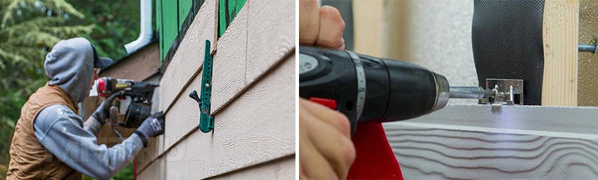 Крепить доски можно либо кляммерами за специальный паз, либо саморезами (гвоздями) сквозь тело, всё зависит от типа сайдинга. Видимый крепёж должен быть нержавеющим или с гальваническим покрытием, чтобы избежать образования ржавых потёков. Сверление в последнем случае не требуется, но шляпка крепежа должна быть утоплена на 1–1,5 мм для заделки следов монтажа. В обязательном порядке крепление доски выполняется по краям и как минимум по одной точке к каждому стоечному элементу.