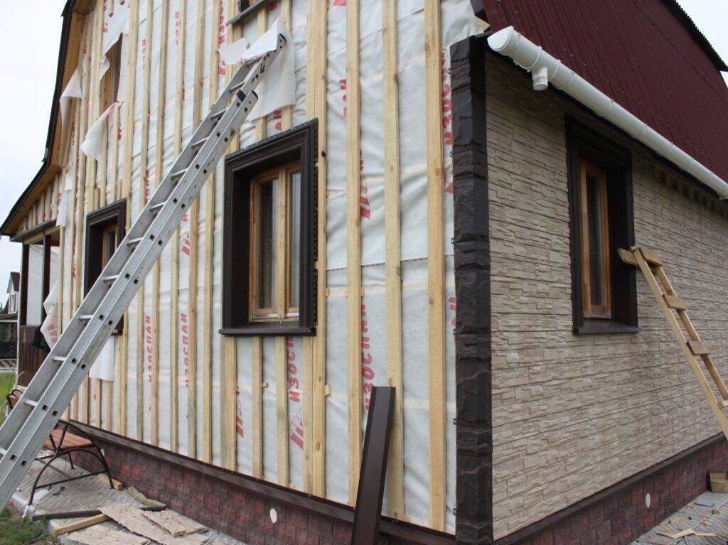 Между направляющими обрешетки укладывают утеплитель. Лучше, если это будет минеральная вата — по причине хорошей проницаемости для воздуха. Поверх ваты требуется закрепить слой гидроизоляции и ветрозащиты. Лучшим вариантом станут современные пародиффузионные (не путать с пароизоляционными) ветрозащитные мембраны.