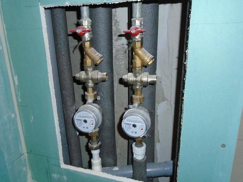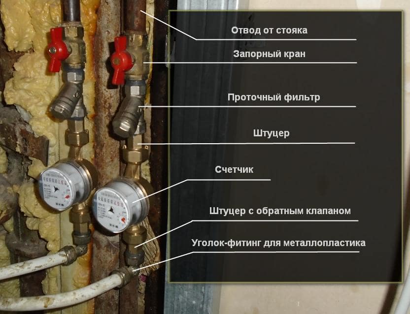 Для корректной работы водомера и удобства эксплуатации, на каждую магистраль подачи воды помимо счетчика устанавливается еще несколько приборов. Перечислим их по порядку от входа трубы в жилище к счетчику: