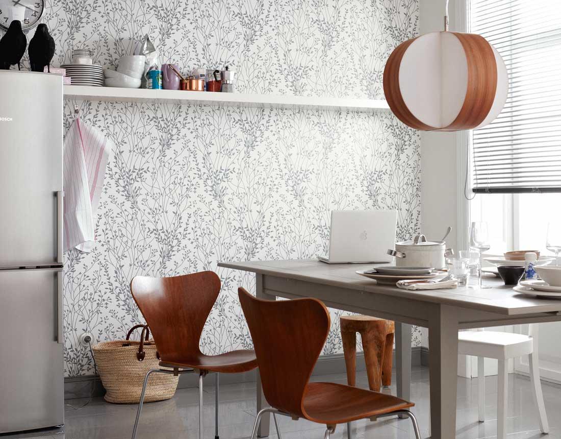 Главным свойством, влияющим на восприятие обстановки кухни, является вид обоев. Обои на флизелине считаются лучшим вариантом оформления кухонных стен. Если выбирается материал под покраску, то лучше брать стеклообои, так как они выносят окрашивание в несколько раз. Бумажные обои – неудачный способ отделки кухни, даже, если они имеют водоотталкивающий слой. Они быстро обесцвечиваются на солнце.