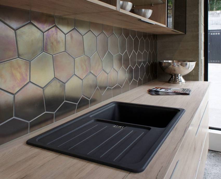 Фигурная керамическая плитка с выступами, шестиугольники и мозаика сделают удивительным фартук.