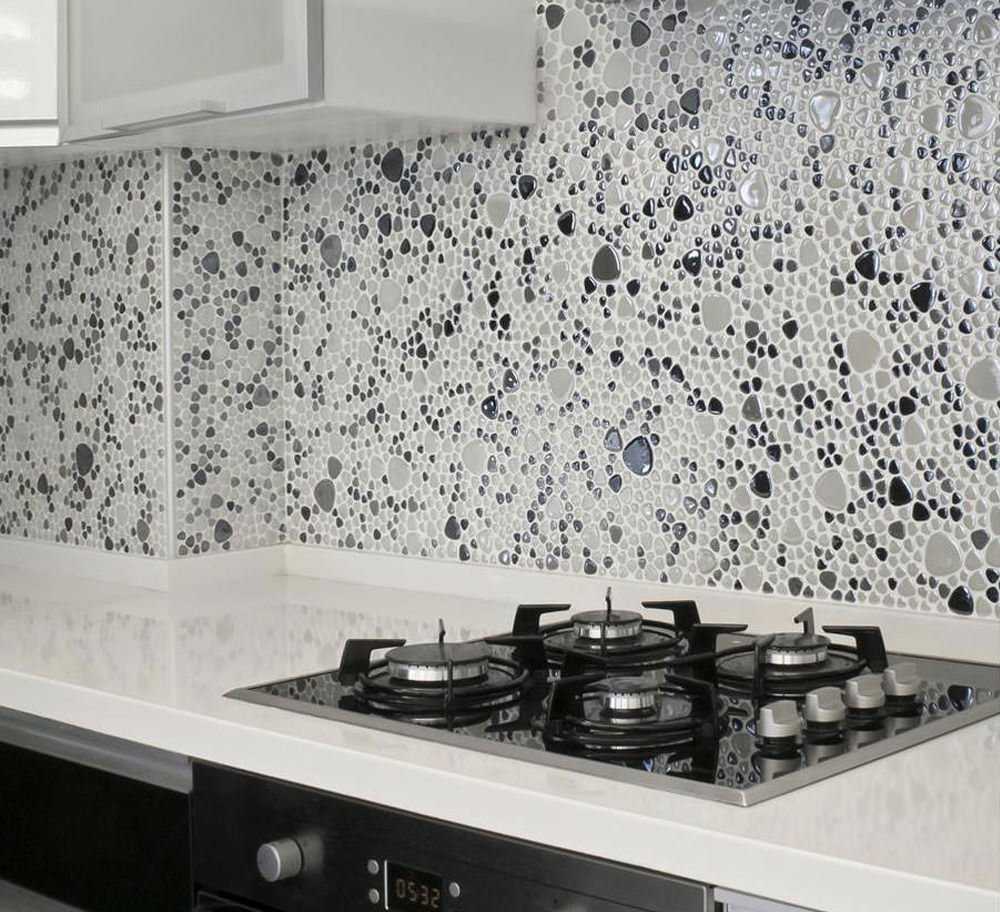 Стекло также считается доступным материалом в ценовом плане, однако оно более практичное и более прочное благодаря обжигу высокими температурами, применяемому в производстве стекла для плитки. В монохромной кухне стеклянная плитка-мозаика станет отличным акцентом, создавая игру цвета благодаря преломлению света. Чаще всего выпускают стеклянную мозаику на сетке, а покрытие поверхности может быть самым разнообразным: глянцевым, прозрачным, матовым, с вкраплениями блёсток или металла.