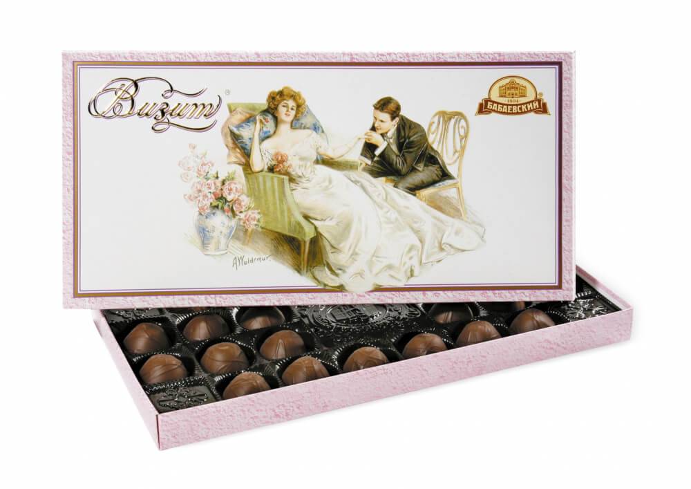 В коробке с изумительно-романтическим рисунком набор пралине со сливочным вкусом, политое сверху ароматной шоколадной глазурью. Такая коробочка станет чудесным ключом» для любых дверей. В гости к друзьям, на свидание к девушке, на чай к бабушке – «Визит» везде уместен.