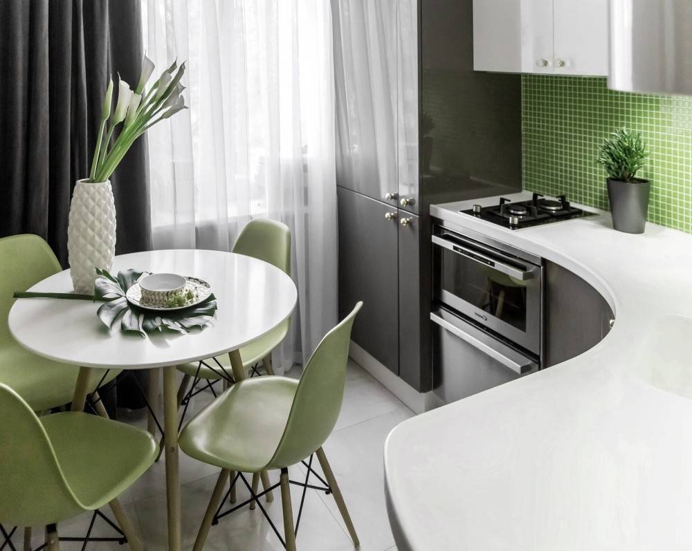 Для него отлично подходят угловые кухни для хрущевки с такой колонкой. Короб агрегата может быть декорирован под пейзаж, натюрморт или орнамент. Природные цвета — белый, светло-зелёный, коричневый хорошо поддержат натуральность материалов – бамбука, дерева, камня.