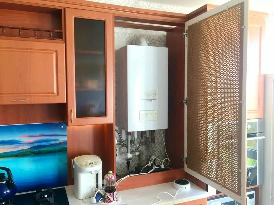 Необходимо обратиться к обученным специалистам. Необходимо наличие хорошей циркуляции воздуха, лучшим вариантом размещения котла является место напротив двери, либо глухая стена. Нормы, согласно которым располагаются розетки, трубы котла. Электророзетка для котла должна быть вмонтирована не ближе 1 м. Правильное размещение холодильника: расстояние между ним и газовыми приборами должно быть не менее 30 см. Расположение котельного оборудования должно быть как можно ближе к тому месту, где труба выходит на улицу. Тогда нет необходимости высверливать отверстия в шкафчике для свободного прохождения дымоотхода. Шкаф, в котором будет установлен котел, нужно обработать составом, который устойчив к огню. Расстояние между стенками шкафа и котлом, должно позволять, в случае необходимости проводить техническое обслуживание. Рекомендуемая высота от пола, на которую вешается газовый котел, должна варьироваться в промежутке от 80 до 160 см, а минимальный разрыв между потолком и корпусом котла составлять 80 см