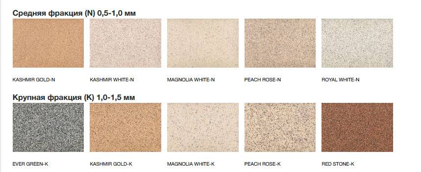 Цвет наполнителей для этой смеси отличается разнообразием. Для фасадов производят смешанный гранитно-мраморный наполнитель повышенной прочности.