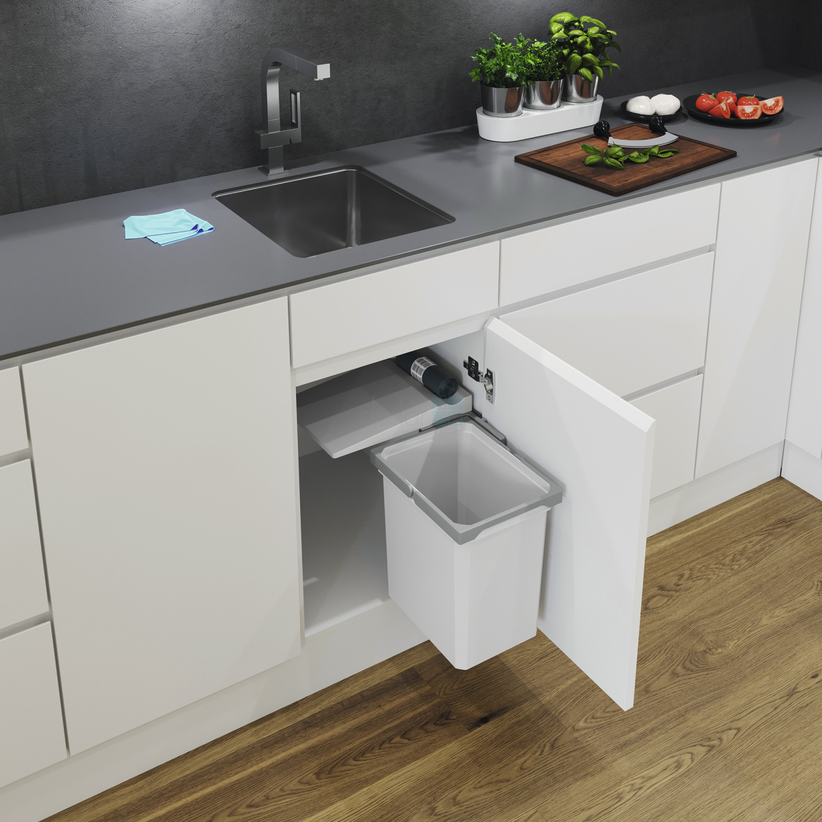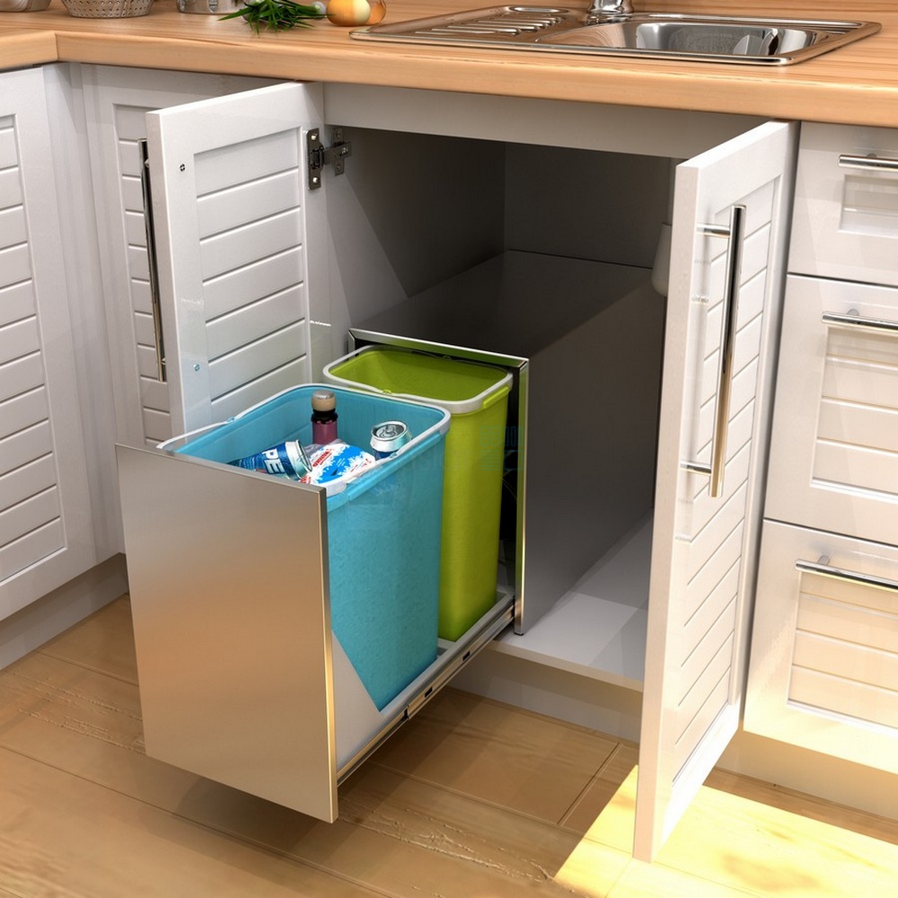 Мусорные ведра встраиваются в кухонную тумбу, нишу мойки, под столешницу либо закрепляются на дверце одного из шкафов с помощью статичных держателей или поворотной карусели. В тумбах и под мойкой часто устанавливают выдвижные контейнеры, закрепленные на направляющих.