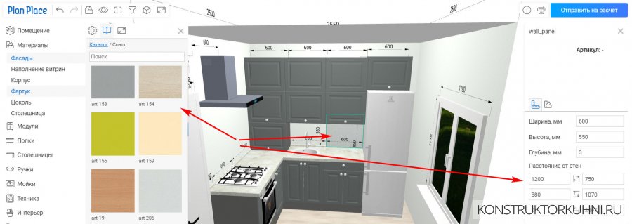 Например, фартук: можно выбрать разные цвета и текстуры, доступен скинали. При клике на сам элемент фартука и нажатии на шестеренку, откроются дополнительные настройки – высота, ширина, глубина (толщина) и расстояние от стен.