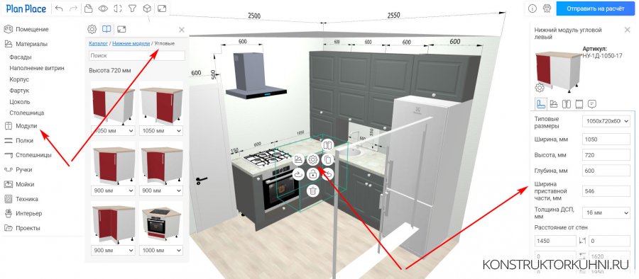 А. Нижние. Если вы хотите угловую планировку, то я бы рекомендовал начать проектировать от угла. Для этого нажмите на Нижние и Угловые, выберите нужный и перетащите его в угол. При выделении шкафа появляются его настройки: