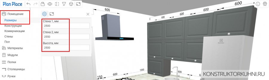 1. Указать размеры кухни