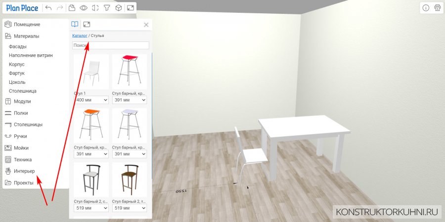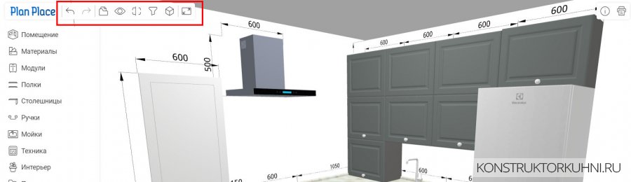 - Выбор элементов для отображения (по умолчания отображаются все) – стены, пол, потолок, столешница, фасады и др.