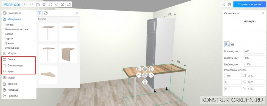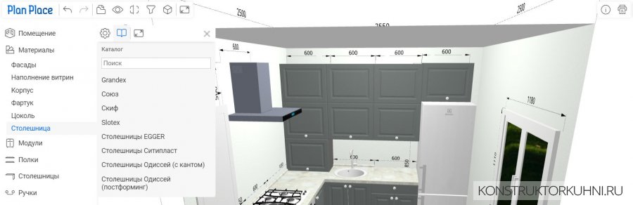 В разделах Корпус, Фартук, Цоколь и Столешница – можно подобрать цвета и производителей, либо другие параметры.