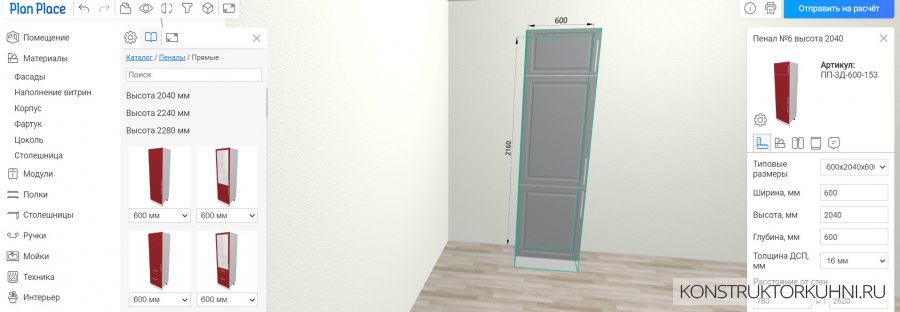Цвет корпуса (по умолчанию белый) и фасада сразу во всех шкафах можно изменить в предыдщем пункте Материалы.