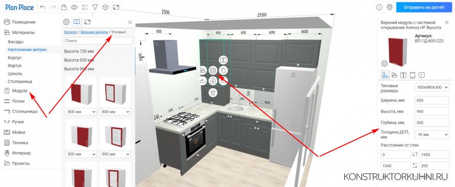 В разделе Модули выбираем Верхние. Начать также лучше от угла: кликаем Угловые и выбираем нужную высоту – 720, 920 либо 960 мм.