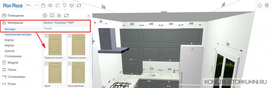 - в других вкладках настроек можно изменить фасад, расположение ручек, плинтуса и цоколя