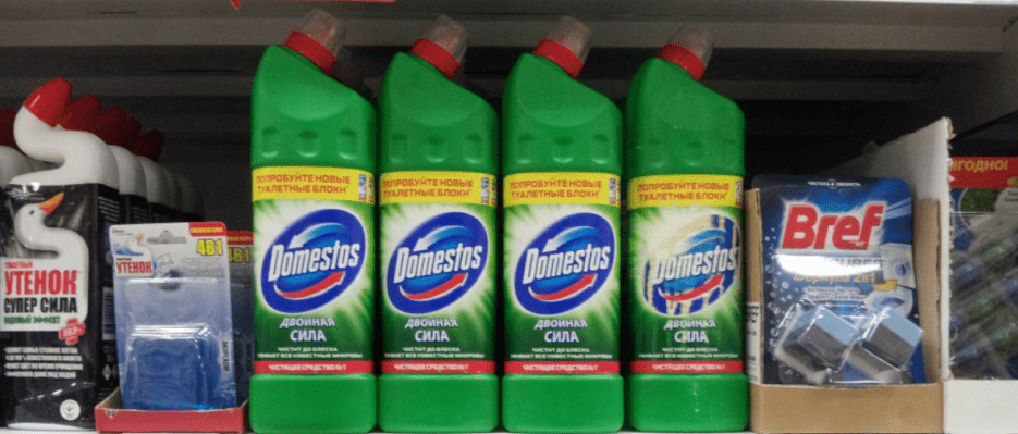 - Доместос — эффективное средство с сильным запахом. Удаляет самые сложные застарелые загрязнения.