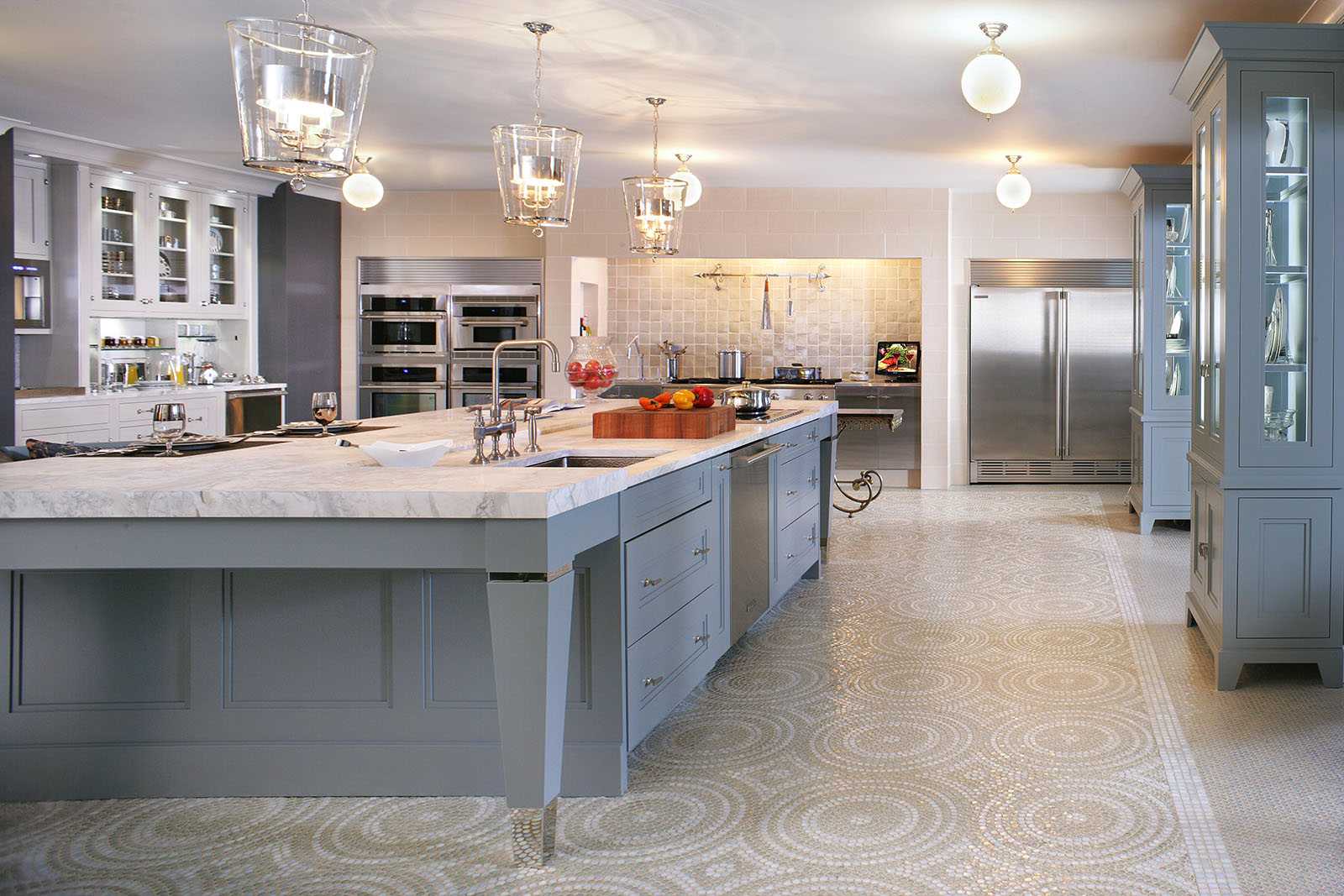 Цветной пол подходит для больших кухонь.