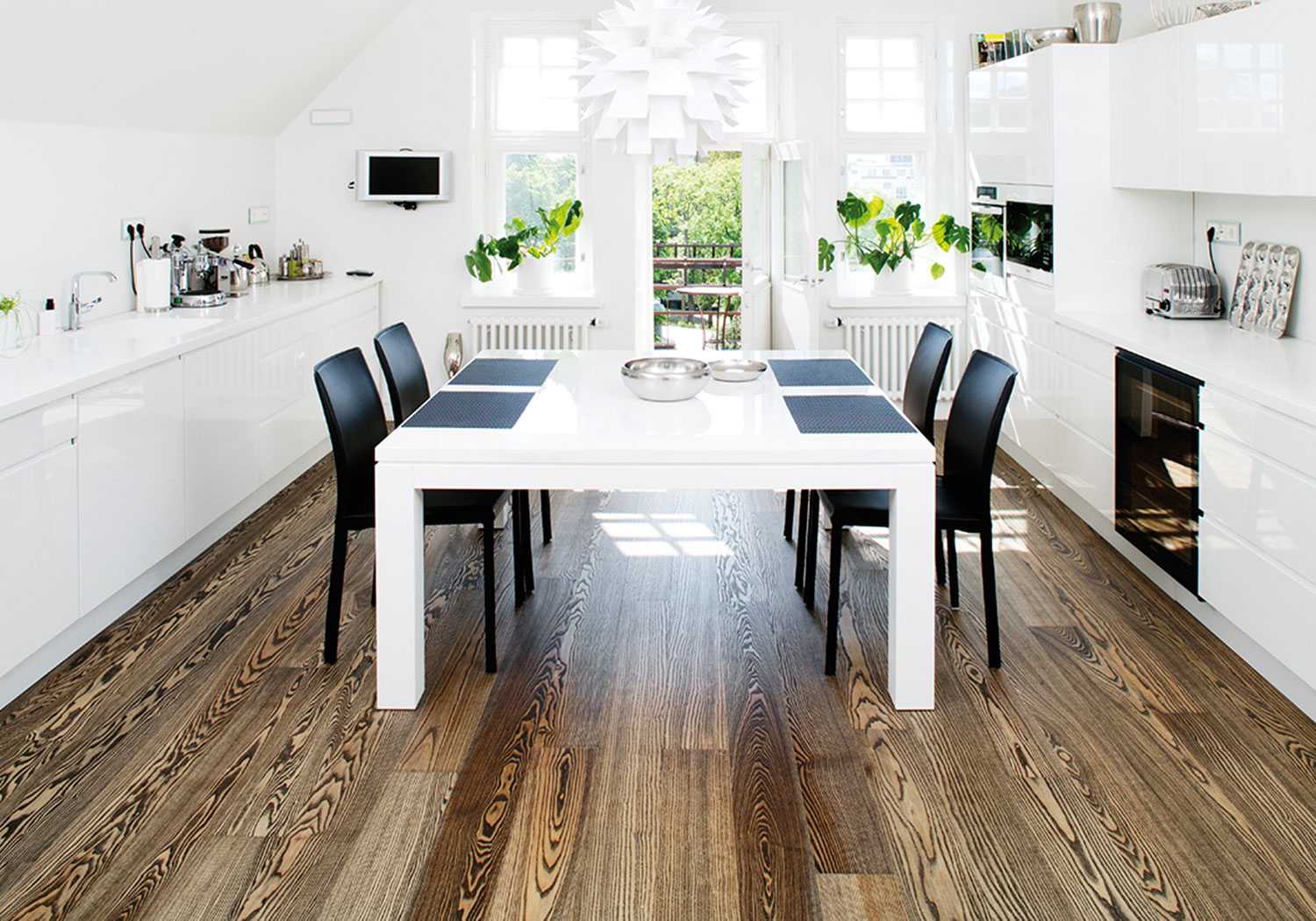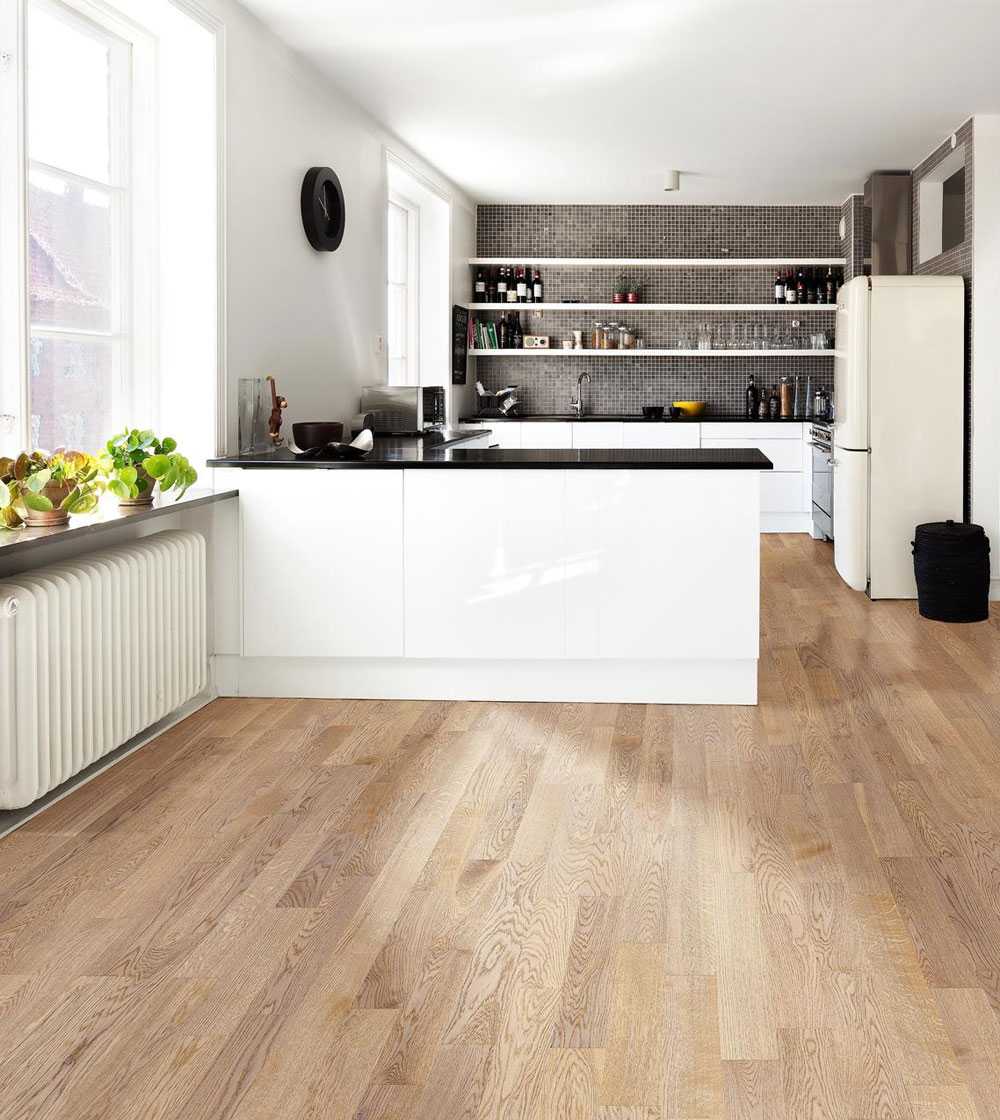 Для белой кухни подойдет деревянное покрытие.