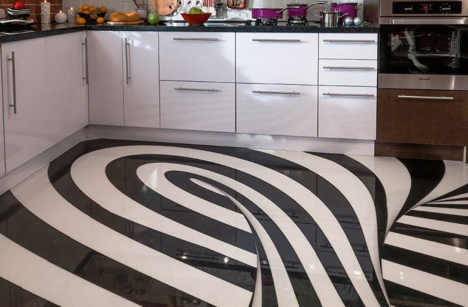 - главное преимущество таких полов – шикарный внешний вид, ведь под слоем полиуретана может быть абсолютно любое изображение. Такой пол может стать не просто украшением интерьера кухни – он диктует стиль интерьера.