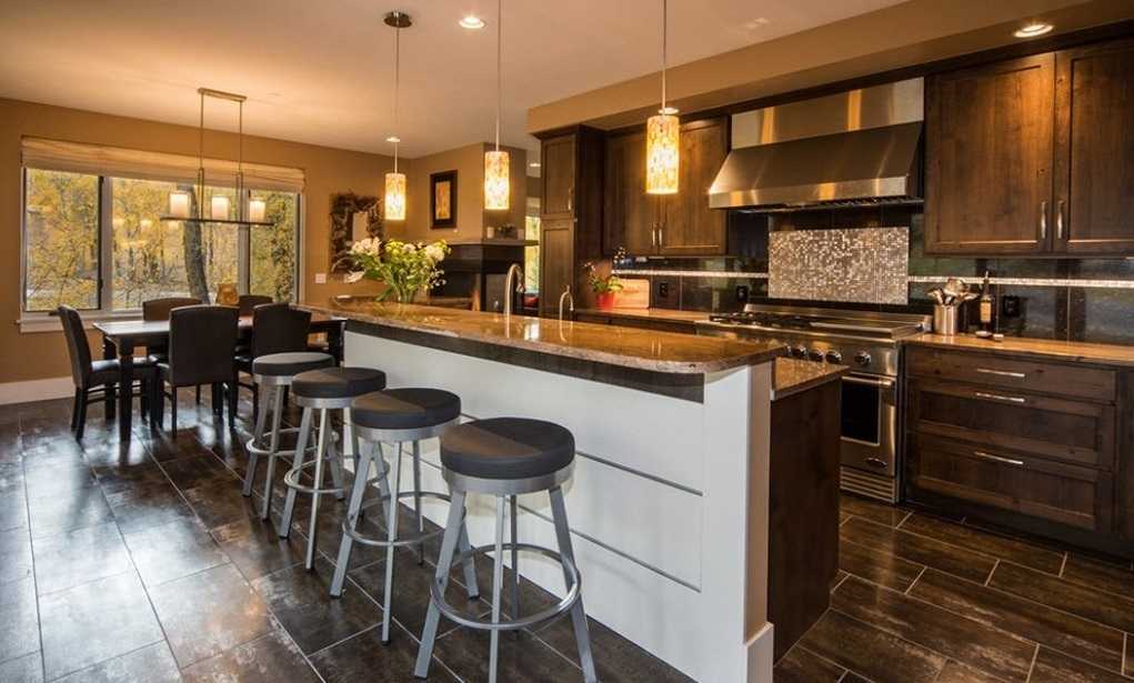 Если сложно остановиться на одном из материалов, можно выбрать несколько из них. Все перечисленные виды напольных покрытий для кухни подходят для этой цели. Это дает возможность выполнить зонирование помещения, путем деления его на рабочую и обеденную зону.
