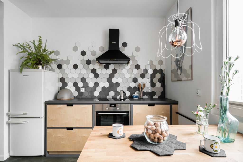 - Калейдоскоп. В данном случае все соты и квадратная плитка в нескольких оттенках наклеивается хаотично. Решение в виде калейдоскопа прекрасно смотрится в современных кухнях.