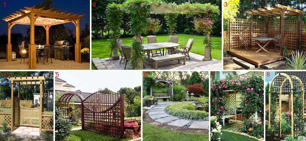 Существует несколько видов пергол для сада и дачи, каждая из которых представляет собой решетчатую конструкцию. Варианты построек: