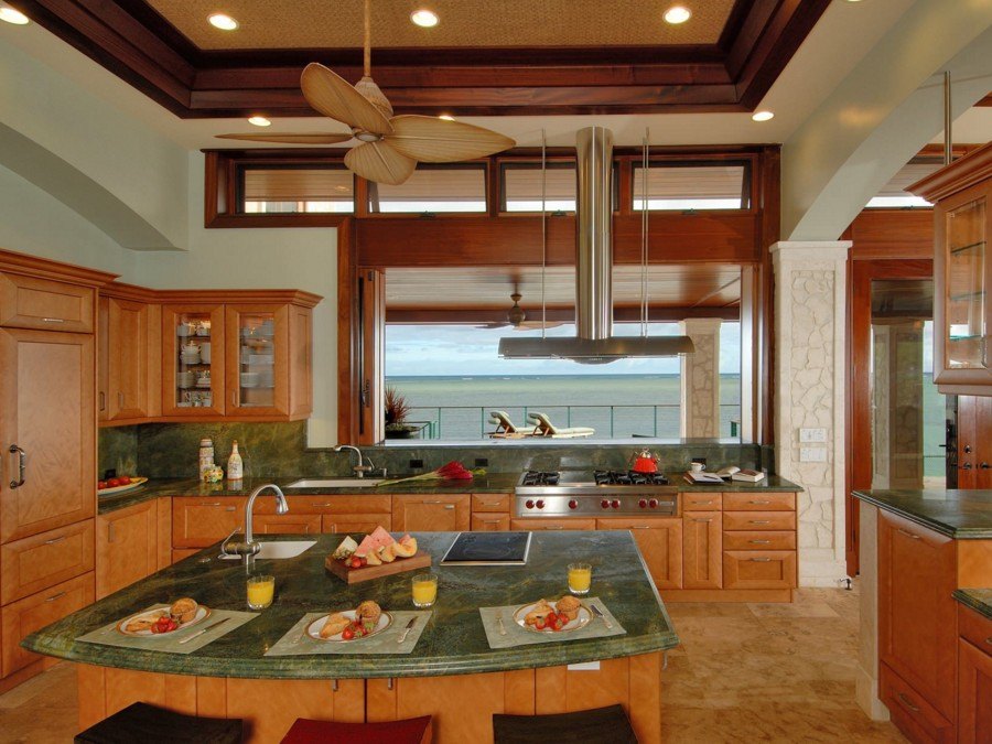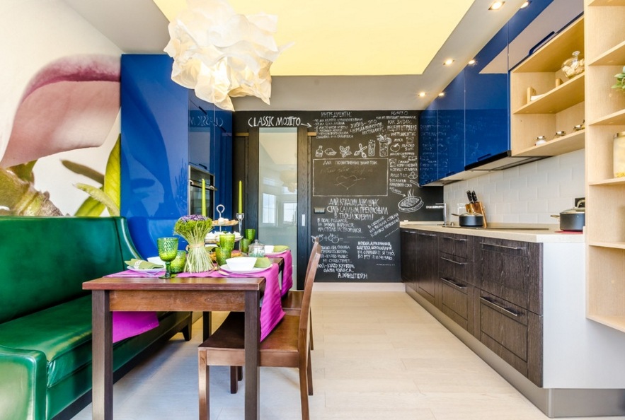 Популярные «звездные» потолки в кухнях, как правило, неуместны – здесь больше подойдут фруктовые мотивы. Изображение голубого неба с легкими облаками или пролетающими птицами позволяет как бы «убрать» потолок вовсе, что сразу же меняет не только зрительную высоту потолка, но и все восприятие интерьера.
