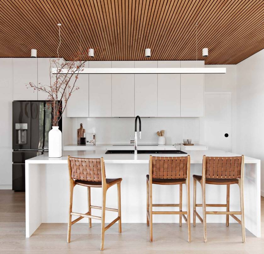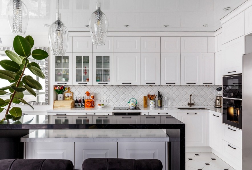 Два уровня потолка – это отличное решение для зонирования кухни-гостиной или отделения столовой от рабочей зоны в просторных кухнях. К тому же, так вы дополните цветовую гамму кухни.