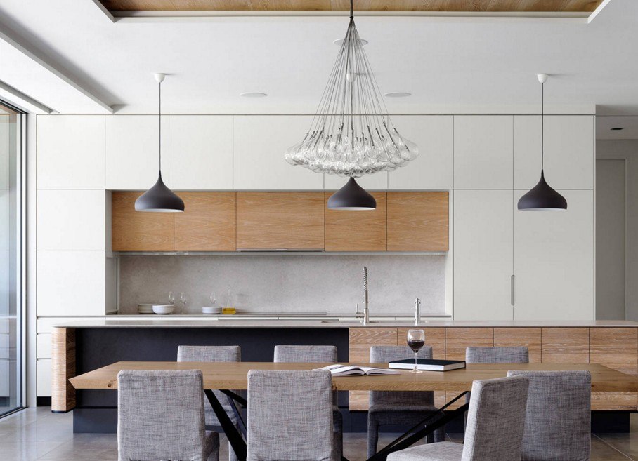 Основным правилом, которое соблюдается дизайнерами при проектировании потолочного освещения любой кухни-гостиной, становится функциональное зонирование пространства. Подключение оборудование выполняется таким образом, чтобы у пользователя была возможность включать или выключать свет в любой из частей помещения в зависимости от необходимости. При установке барной стойки, отделяющей зону кухни и гостиной, разделение пространства мебелью стоит деликатно поддержать расположенными над ней подвесными светильниками. Над обеденной группой можно расположить люстру. При желании дополнительное декоративное освещение можно организовать с помощью торшеров, бра, настольных ламп. Для локальной подсветки деталей интерьера используют источники направленного света.