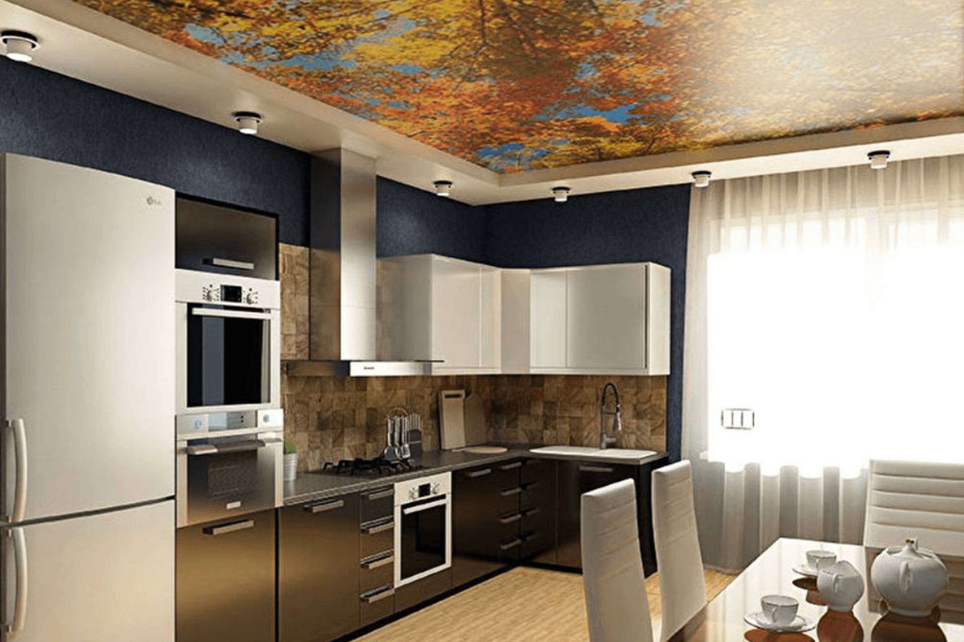 На материал, из которого изготавливают натяжные потолки на кухню, можно нанести любое изображение. Делается это методом фотопечати. Грамотный подбор рисунков для нанесения может полностью преобразить помещение, исправить его пропорции, сделать светлее или наоборот, убрать излишнюю освещенность, если кухня выходит на южную сторону и имеет большие окна.