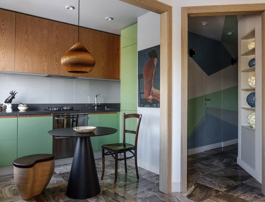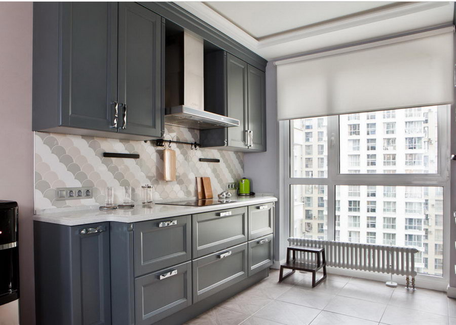 Такое покрытие отражает свет и окружающую обстановку, особенно в тёмном исполнении. Благодаря этому пространство зрительно расширяется. Однако этот эффект подходит только аккуратным хозяйкам, ведь беспорядок на кухне тоже будет удваиваться, как в зеркале.