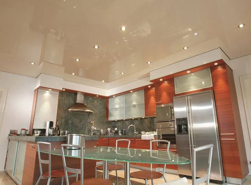 Оригинальные светильники являются элементом стиля кухни. Так, красоту глянцевого потолка удачно подчеркивают хрустальные встроенные светильники. Они создают на потолке узоры и лучи, которые, отражаясь в зеркальной поверхности пленки, создают фантастические картины. Если кухня выполнена в стиле модерн, то потолок может быть и матовым, а светильники — квадратными, ромбовидными либо прямоугольными.