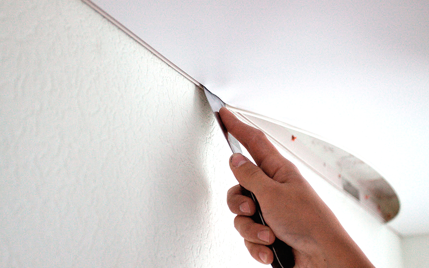 Соприкосновение стен и потолочного полотнища – зона образования небольшого зазора, в который необходимо установить мягкий профиль (называемый заглушкой). Этот декоративный элемент не только украшает конструкцию, но и выполняет защитную функцию: если сосед сверху решит затопить вашу кухню, вода не польется на голову. Весь объем воды останется внутри потолочной конструкции. Только потом ее необходимо будет оттуда откачать.