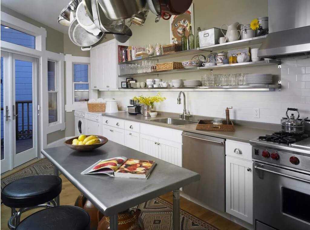 Размещение на кухне конструкций открытого типа является оптимальным вариантом, позволяющим решить одновременно несколько проблем. Приобретение кухонного гарнитура требует довольно больших расходов, а использование полок открытого типа – это в первую очередь возможность сэкономить часть финансов. На изготовление таких элементов мебели уходит гораздо меньше материала, поэтому их стоимость ниже.