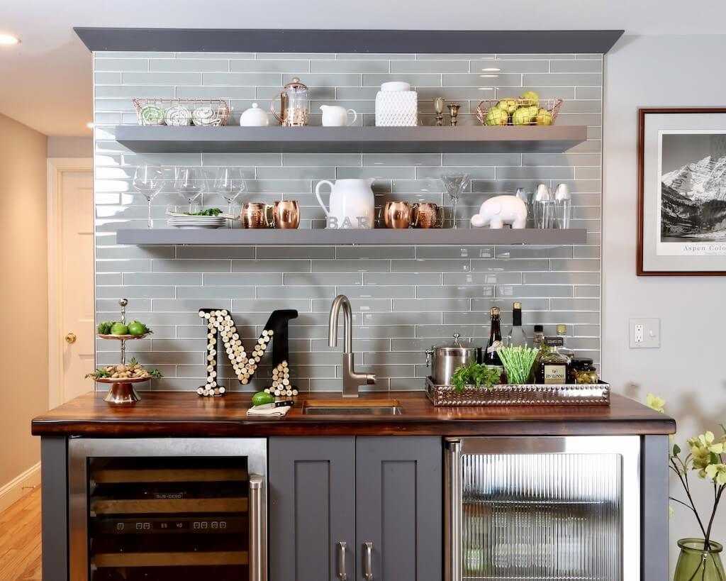 Полочки, встроенные в крайние модули кухонного шкафа, островного гарнитура либо нишу, разнообразят интерьер