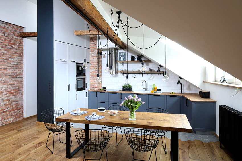 Стену в обеденной зоне можно декорировать полками из перевернутых фанерных ящиков, стеллажами, опирающимися на бетонную стену. Несмотря на прочность и большую массу конструкций, они не несут функционального посыла. Главный упор делают на акцентах индустриального направления.