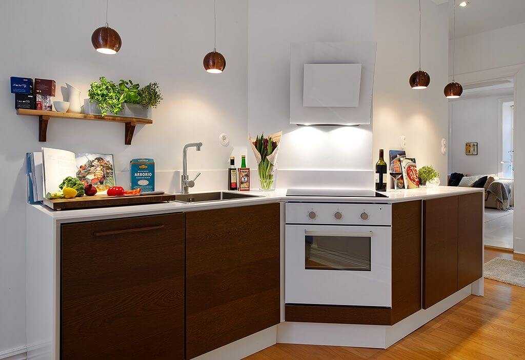 - В стесненных по площади кухнях, выбирая такой вариант мебели, можно сэкономить полезные метры площади за счет отсутствия необходимости в установке с расчетом площади, которая будет использована для открывания створок.