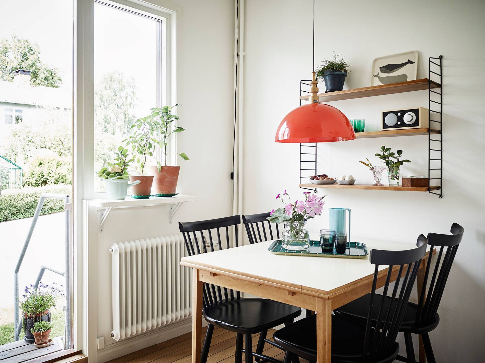 Полки должны быть просторными. Не допускается одновременное нахождение функциональных предметов и элементов декора. Основное назначение полок на кухне в скандинавском стиле – акцент на стилистической направленности. Удачно подчеркнуть оригинальный дизайн помогут следующие предметы: