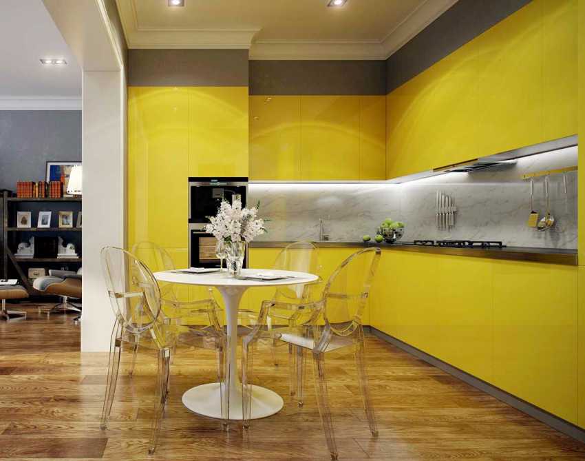 Как правило, кухонные гарнитуры для небольшого помещения выбирают светлых тонов. Лучше приобрести обеденный стол с круглой или овальной столешницей. Идеальным вариантом может быть стол-трансформер или раскладной столик. Если столешницу обеденного стола выполнить стеклянной, а ножки стола и стульев хромированными, то их отражающие свет поверхности также поспособствуют расширению кухонной зоны.
