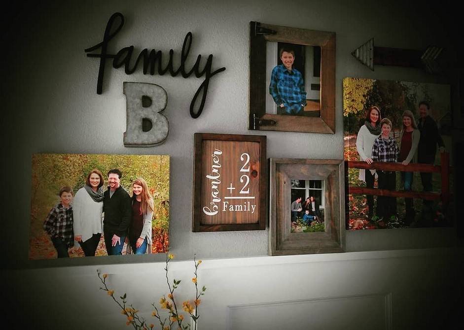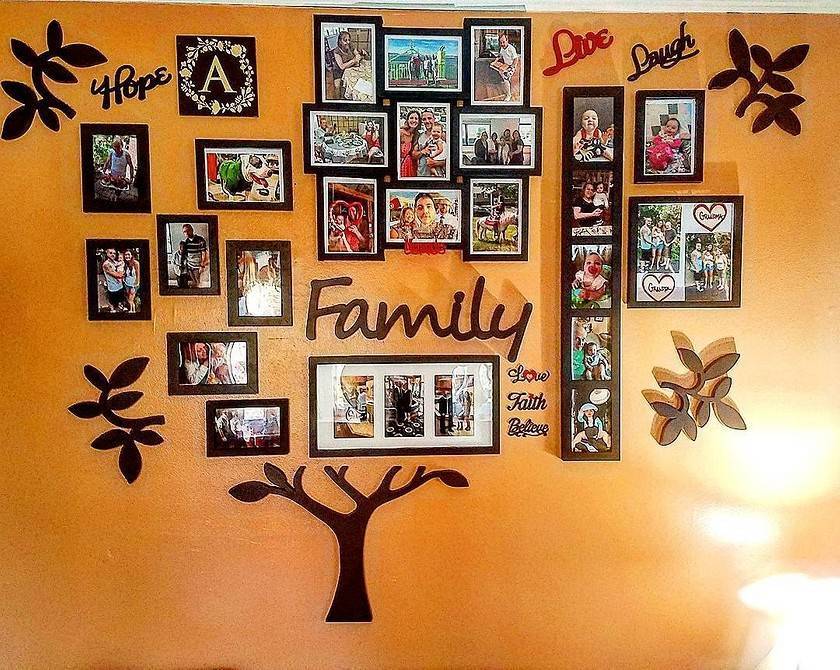Дерево с фотографиями на ветках ― отличная идея для оформления семейных фото. Ствол с ветвями можно нарисовать самому или воспользоваться виниловыми наклейками.