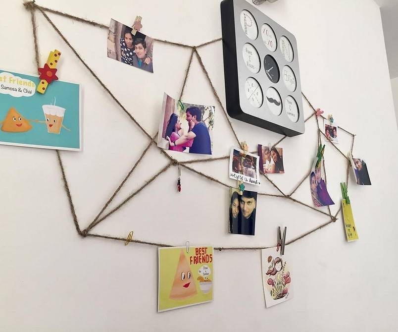 Альтернативное решение ― поместить фотокарточки близких и дальних родственников в сетку из декоративного шнура и обозначить родственные связи разноцветной крученой нитью: один цвет ― для супругов, второй ― для детей и родителей, третий ― для братьев и сестер.