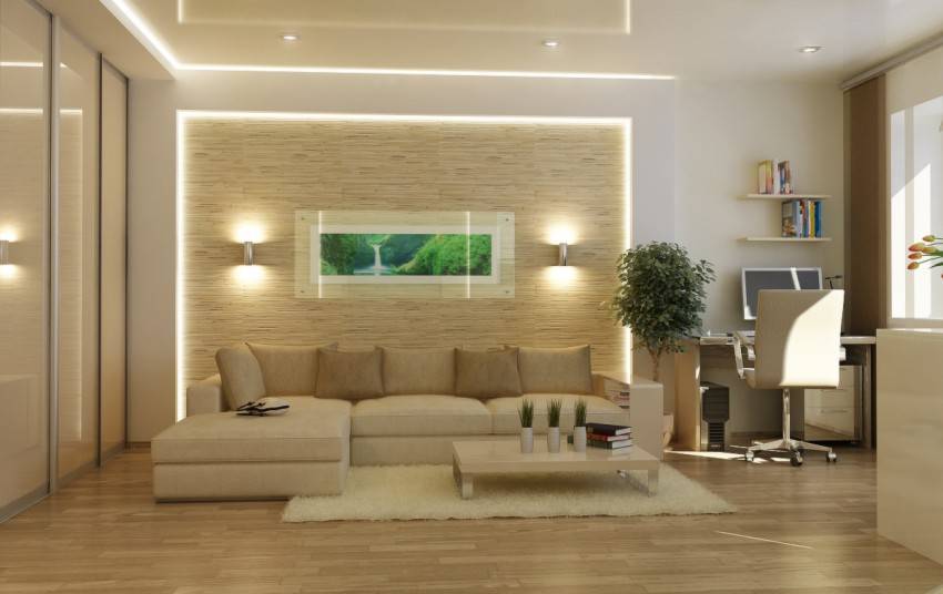 Довольно интересно в интерьере смотрится ниша под телевизор с подсветкой. Для освещения конструкции подходят следующие виды осветительных приборов: