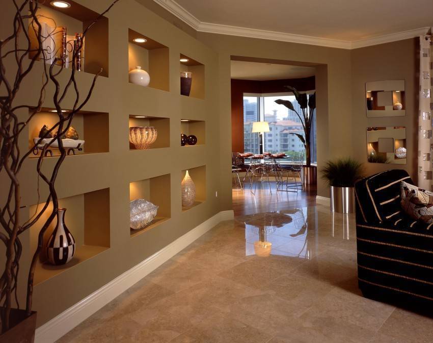 Вариантов оформления ниш очень много. Ознакомиться с различными примерами можно по фото ниш в гостиной. На основе примеров можно разработать собственную концепцию обустройства и декорирования ниш, которые будут выступать и декоративными, и функциональными элементами.