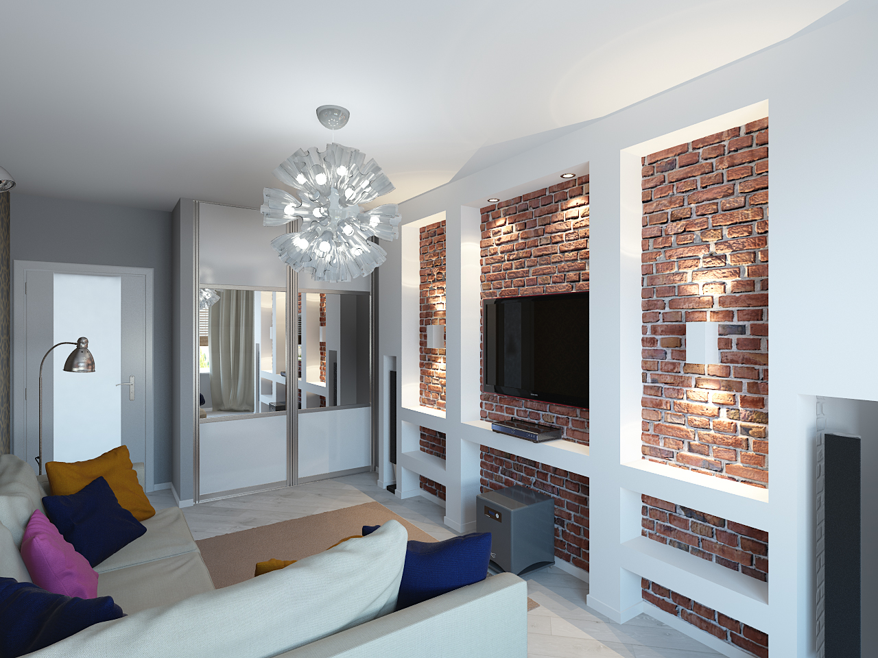 Углубление-альков в гостиной может превратиться в уютный камин.