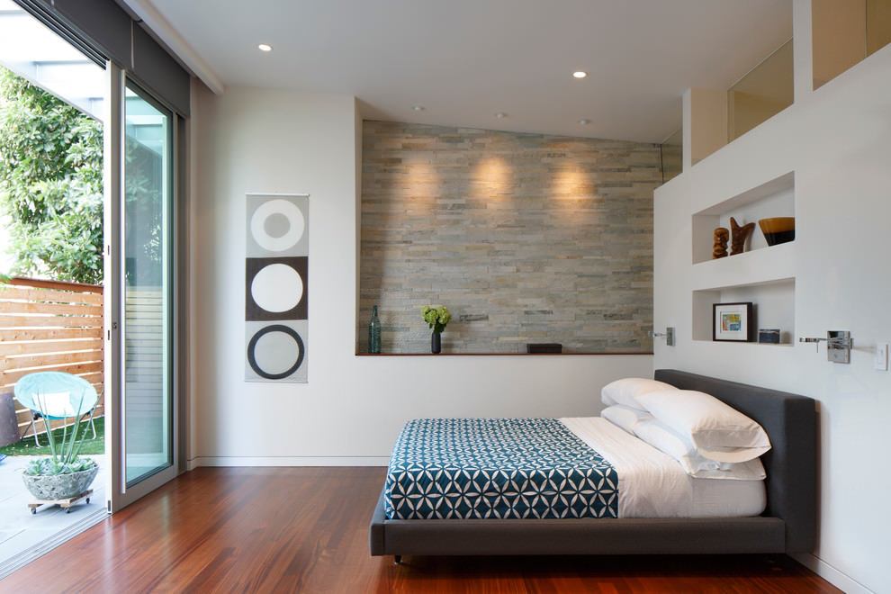 Для больших предметов, например, кровати, шкафа идеальны ниши на уровне пола, то есть функциональные. Такое углубление интерьера можно расположить в спальне. Дизайнеры пришли в мнению, что такие углубления в стене обязательно должны быть дополнены другими элементами, например, меньшими нишами рядом или многоуровневым потолком.