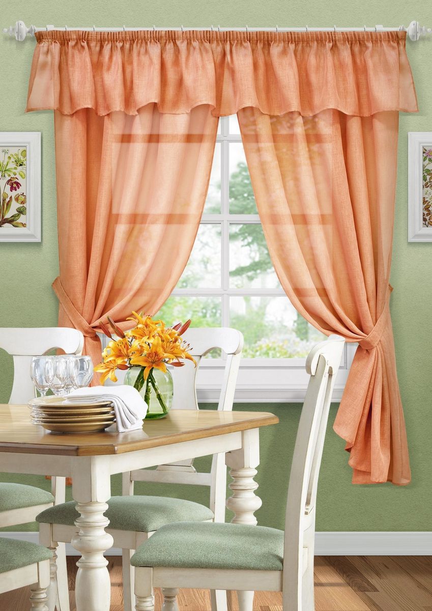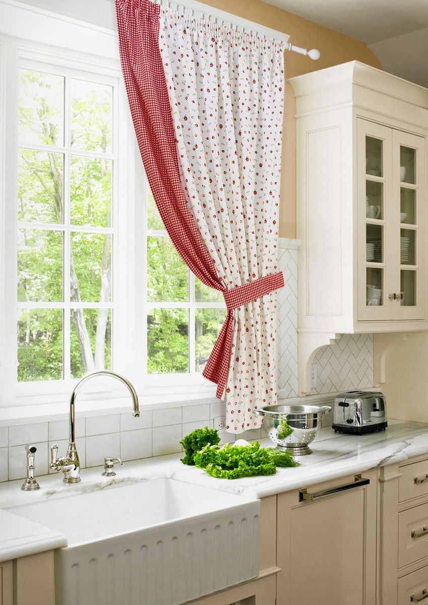 Для кухни выбирают легкие полотна: шелк, лен, ситец. Лучше, чтоб занавески были светлых, жизнерадостных оттенков. Если шторы имеют небольшую длину, то ткань должна закрывать подоконник с припуском в 10-15 см. Допускается использование двойных полотен с легкой драпировкой.