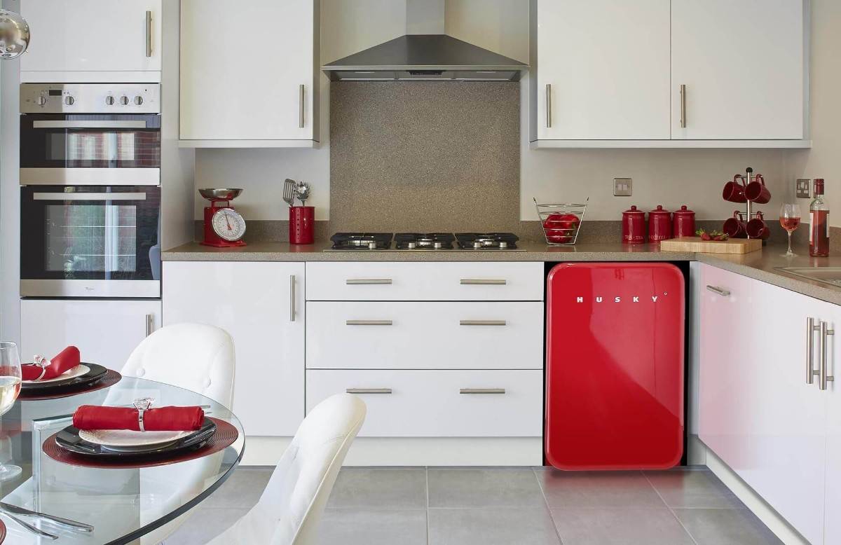Красный в качестве ярких акцентов в дизайне белой кухни