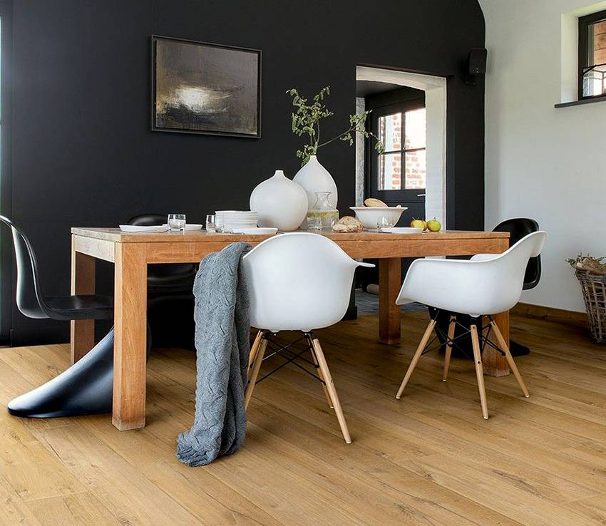 Прямоугольный стол удобен тем, что его можно разместить как возле стены, так и по центру помещения