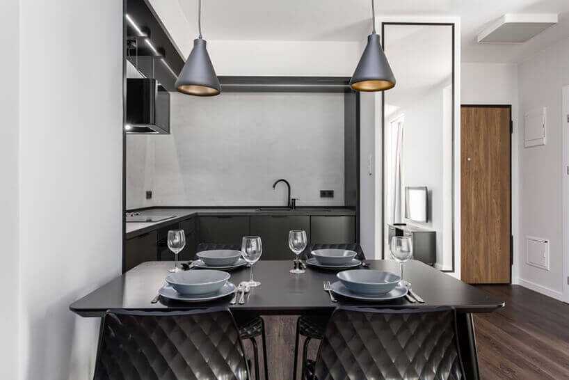 - Столы в линейном стиле с прямыми и одинаково прямыми углами – хороший вариант для кухни в минималистском стиле.
